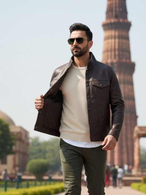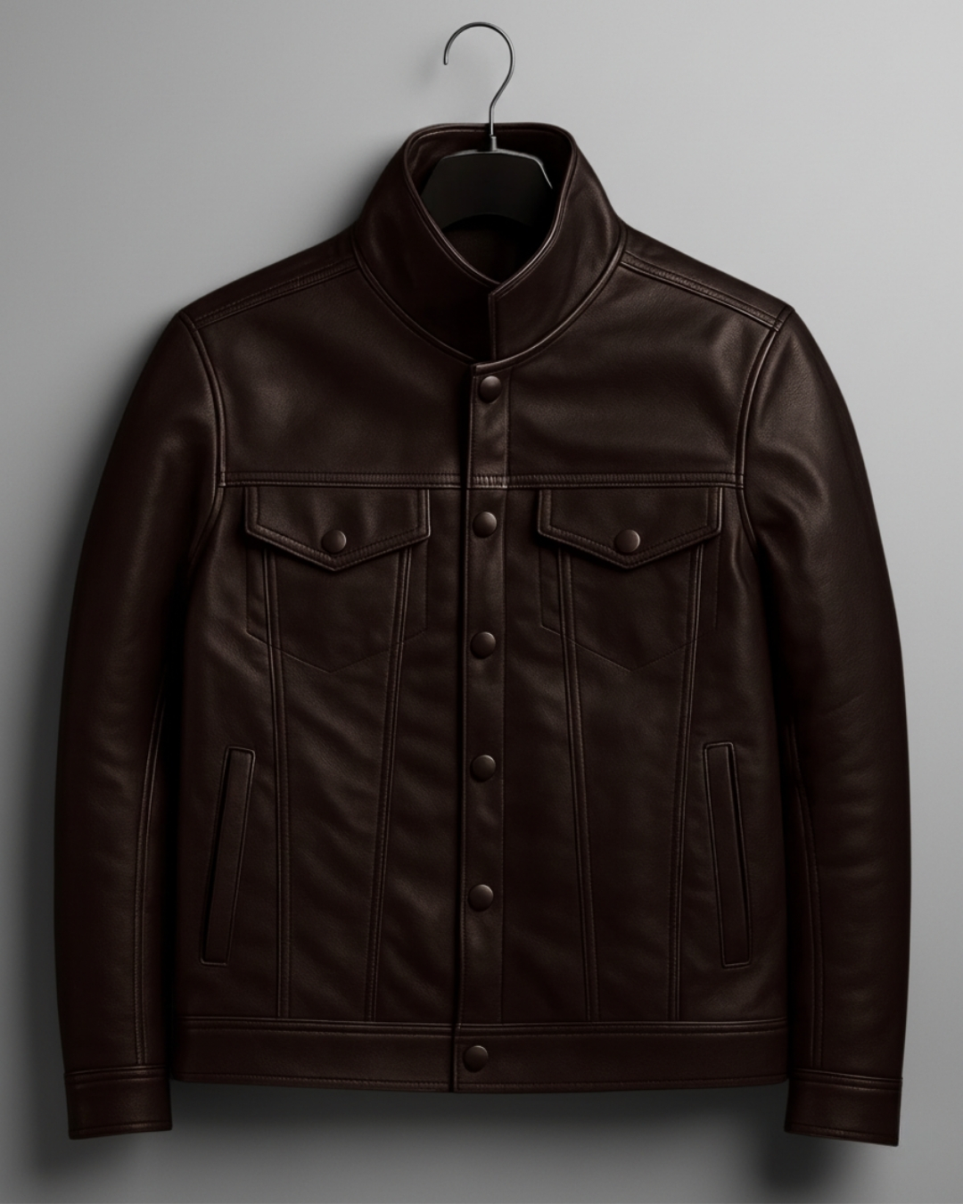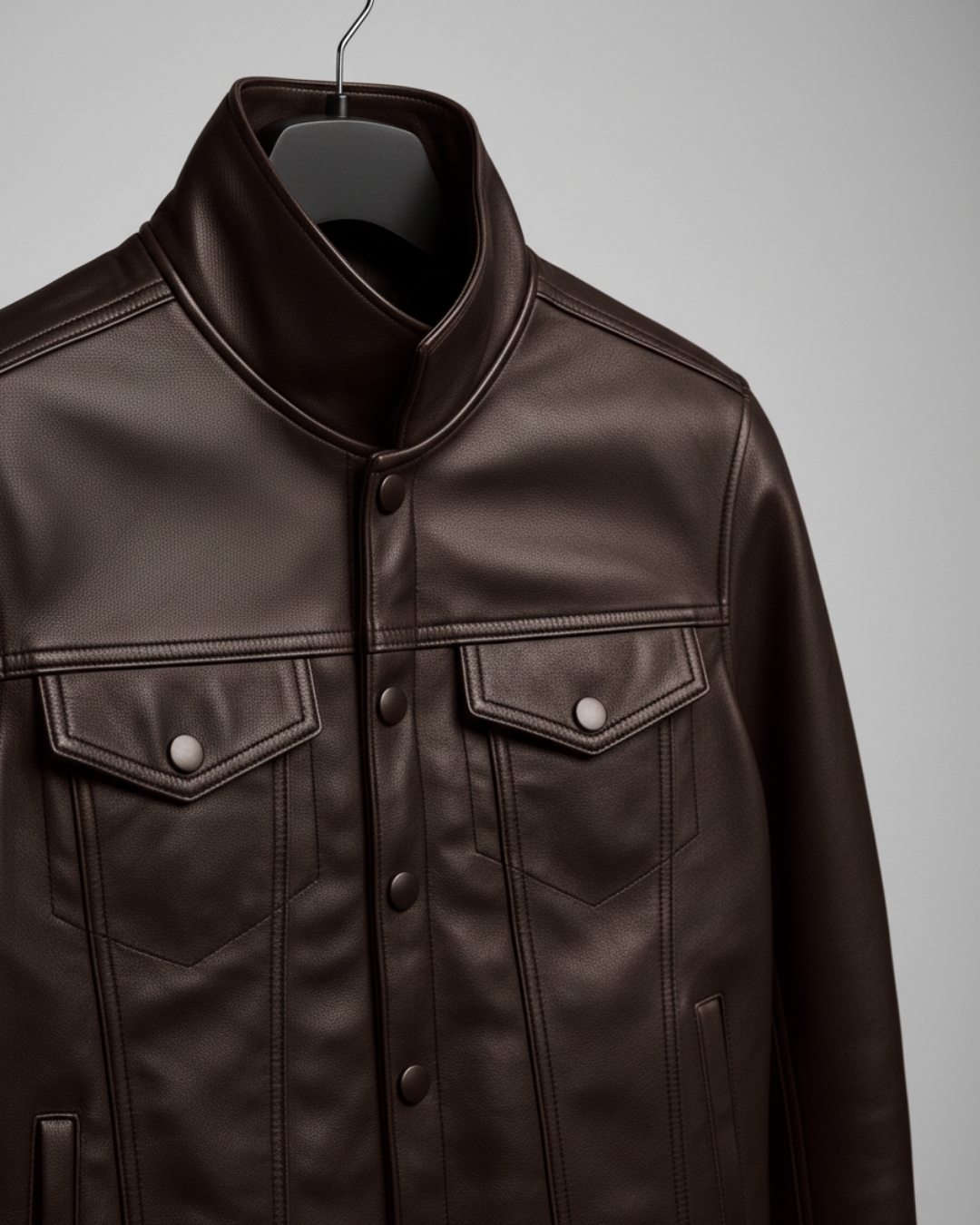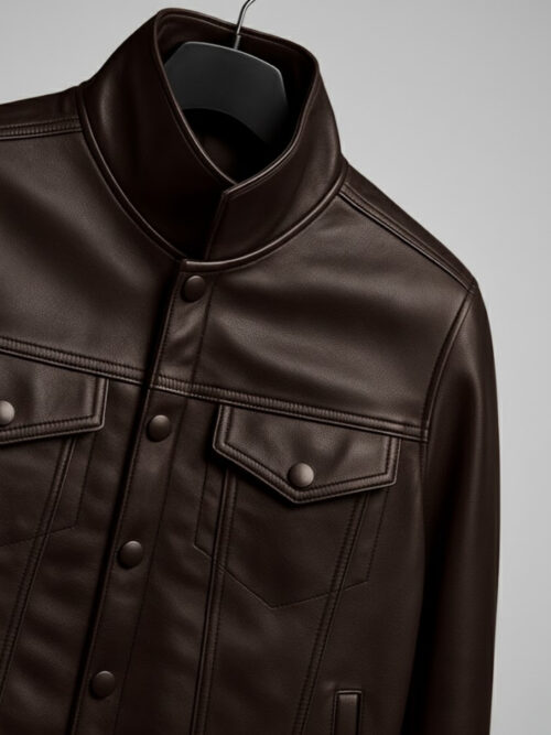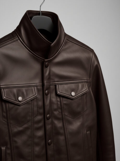 The Vanguard reinvents the trucker jacket in premium brown vegan leather — structured, weather-ready, and built for the man who values both tradition and progress.